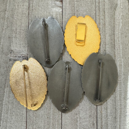 Here are 5 badges in the liquidation catalog… 2 gold badges, 3 gun metal finishes… each have some type of imperfection on them.. see photos for details. The best one is the gold Bail Surety badge with the crooked clip…. the front of that badge is perfect… the others have issues…